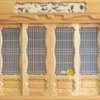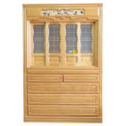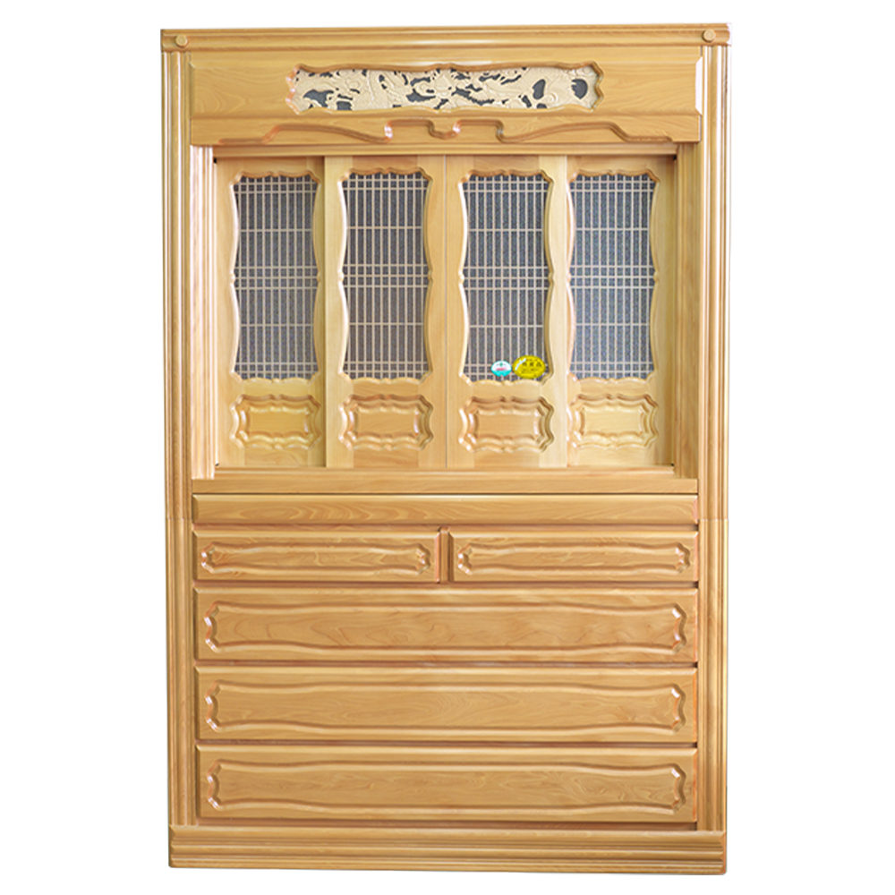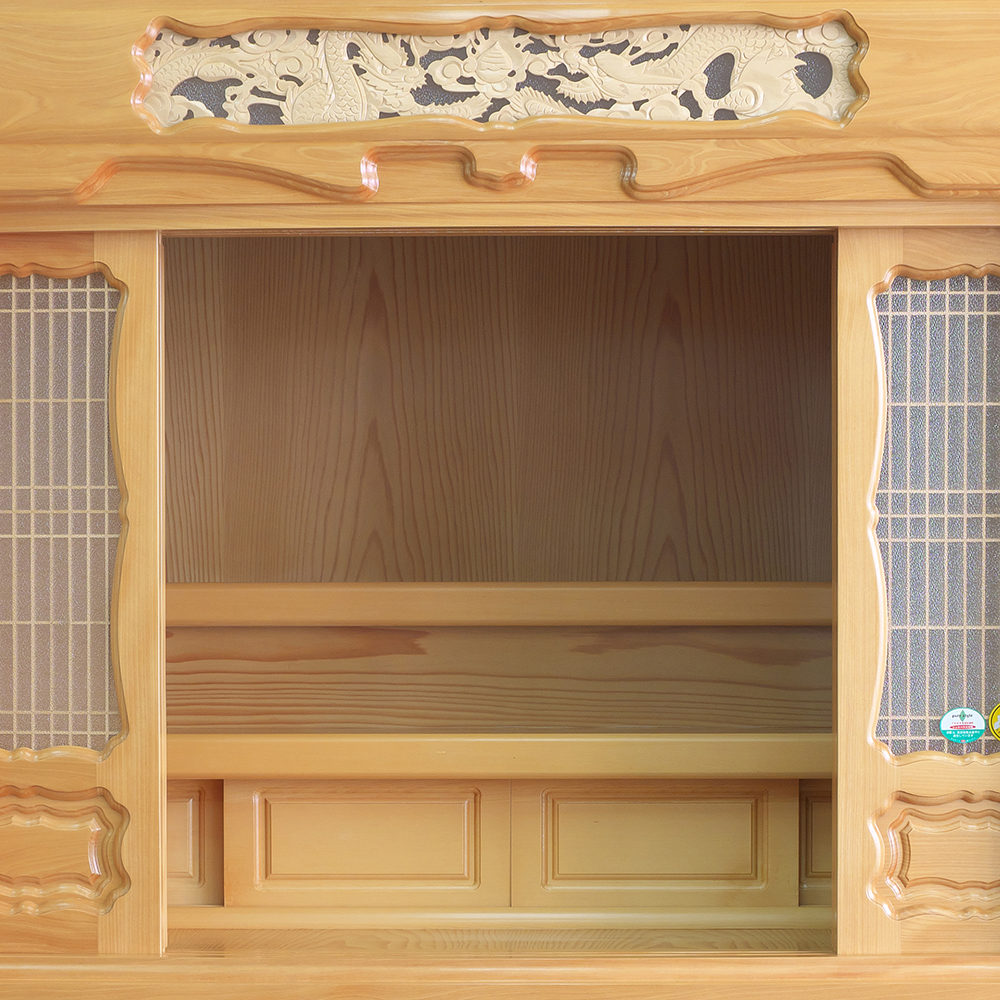 沖縄式のお仏壇です。画像のお仏壇は色がナチュラル色、欄間は龍、下部は引き出しタイプです。他のタイプからもお選びいただけます。